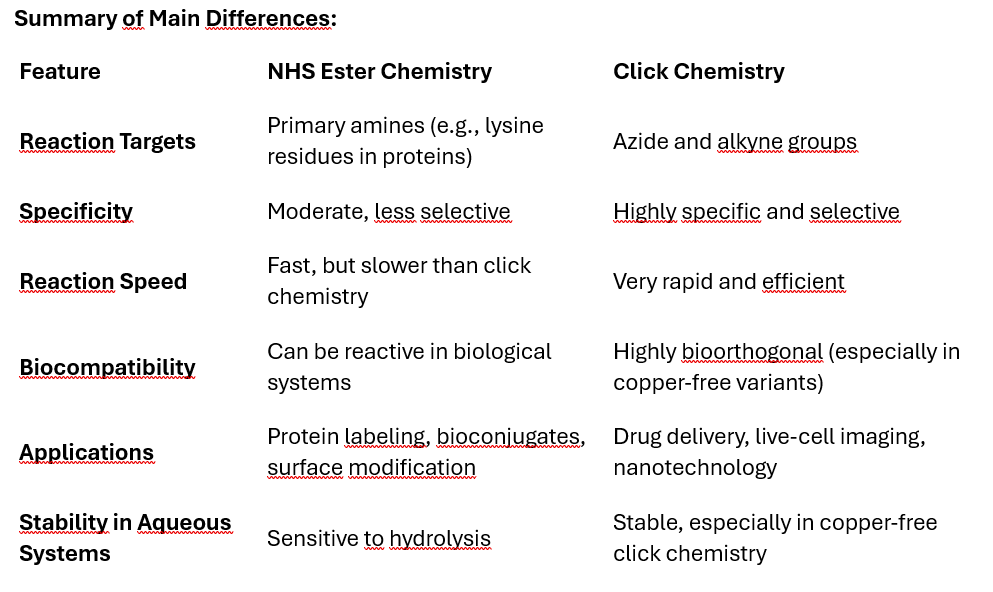 NHS (N-hydroxysuccinimide) ester chemistry and click chemistry are both commonly used methods in bioconjugation, but they differ in their mechanisms, specificity, efficiency, and applications. Here's a comparison of the two: