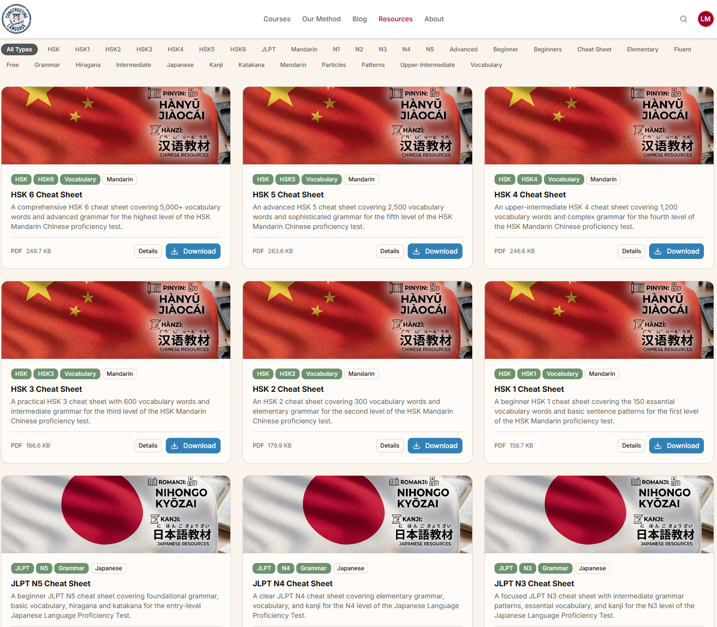 For Chinese Learners: Comprehensive HSK 1 through HSK 6 cheat sheets covering everything from basic sentence patterns to advanced grammar and over 5,000 vocabulary words.